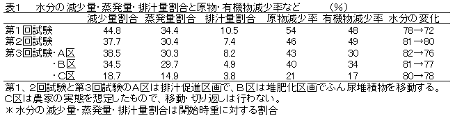 本施設でのふん尿の原物減少率は40~54%であって、減量化がはかられる。また切り返しによって水分蒸発量と排汁量の増加が進んで水分除去がはかられ(表1)、取扱い性が改善される。 |