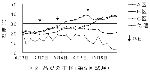 農家の実態を想定した壁なし、切り返しなしのふん尿堆積(C区)と比べて、本施設(A、B区)では水分の低下は大きく、有機物減少率は高く(表1)、品温は上昇して(図2)、堆肥化が進む。 |