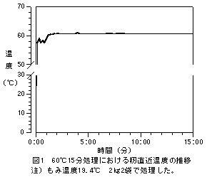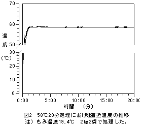 温湯投入後の籾袋(4Kg)内部の籾温度推移では,60℃と58℃いずれの処理温度でも開始後1分で温度の一時的な低下が認められるが,2分後にはほぼ設定の温度条件となる(図1,2)。 |