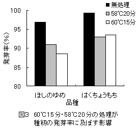 60℃10分または58℃15分の温湯処理による種子の発芽率は、「ほしのゆめ」、「はくちょうもち」、「あやひめ」ともに3%以内の低下にとどまり、大きな影響は見られない(図3)。 |