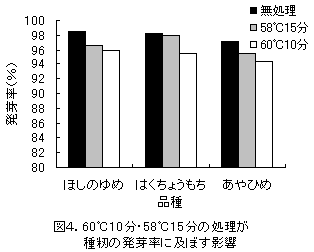 60℃15分では「ほしのゆめ」で8.5〜19.1%、「はくちょうもち」で5.8〜6.0%、58℃20分では「ほしのゆめ」で6.0〜13.0%、「はくちょうもち」で3.0〜6.0%の発芽率の低下が認められる。「あやひめ」は「ほしのゆめ」と同様の傾向である(図4)。 |