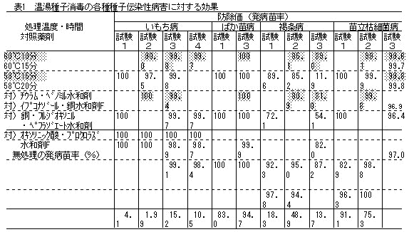 以上の結果から、発芽率、苗形質に及ぼす影響と防除効果を総合的に判断し、処理条件とし ては60℃10分または58℃15分が妥当である。 |