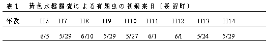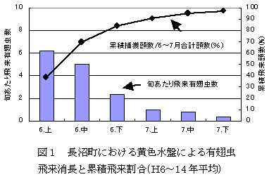 黄色水盤による捕獲データ(図1)およびわい化病の感染時期に関する調査結果から、長沼町におけるダイズわい化病の一次感染に関わる重要な防除時期は6月下旬以前と判断される。 |