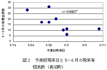積算温度による予測初飛来日が早い年次には、6月中の飛来頭数が多くなる傾向がある(図2)。 |