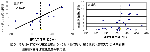 十勝農試開発の発育零点1℃、2世代分の積算温度480日度(平成2年度北海道指導 参考事項)を用いた本種飛来期予測モデルによる飛来期予測、薬剤散布開始時期決定法(400日度到達日の7日以内)は、長沼町においても適用可能である。 |