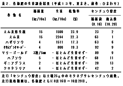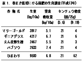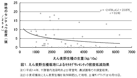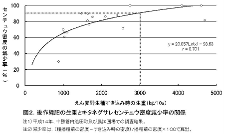 | キタネグサレセンチュウ被害に対する対抗植物として休閑緑肥のえん麦野生種、マリーゴールド、ハブソウが有望である。小麦収穫後の後作緑肥として導入するえん麦野生種は、線虫密度を90%以下にするためには、すき込み時の生育量を3000kg/10a確保する必要がある。 | |