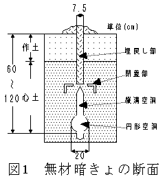 無材暗きょは、クローラトラクタに直装した掘削機で深さ60〜120cmに、幅7.5cm程度の縦溝空洞と円形空洞を掘削し、空洞上部を閉蓋して閉蓋部より上方を掘削土で埋戻す工法であり(図1)、管、疎水材など一切資材を必要としない。 |