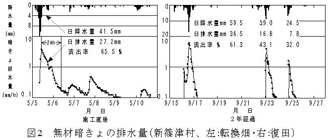 無材暗きょの排水量及び流出率は通常の暗きょ以上で、2年後も流出率が30%以上と高く(図2)、9年後でも排水機能が維持されている。 |