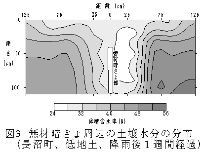 無材暗きょは迅速な地下水の低下と作土からの余剰水排除により、土壌水分が広い範囲で低下する(図3)。 |
