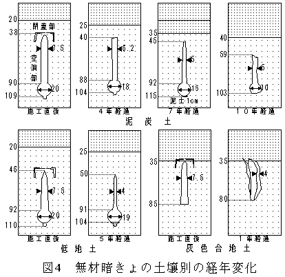 施工後の溝空洞の経年変化を比較すると、泥炭土では7年後で縦溝空洞がやや狭くなり、10年後で溝空洞が40%減少するが、排水機能は維持される。一方、低地土では泥炭土より溝空洞が正確に掘削できるが、5年後には溝空洞がやや減少する。これに対して、台地土は溝空洞が崩落しやすく、本法の適用が難しい(図4)。 |