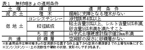 泥炭土と低地土に対する無材暗きょの適用条件を表1に示す。 |
