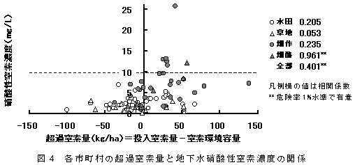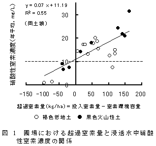 このことから、地下水の硝酸性窒素濃度を環境基準以下に維持する窒素管理方策として、投入窒素量を窒素環境容量の範囲内とする肥培管理が有効である。 |