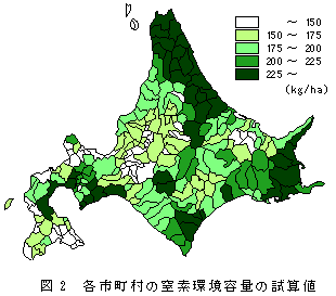 窒素環境容量の全道平均は183±41kg/haであり、草地主体(225kg/ha)>畑酪主体(200)>畑作主体(170)>水田主体(159)の順である(図2)。 |