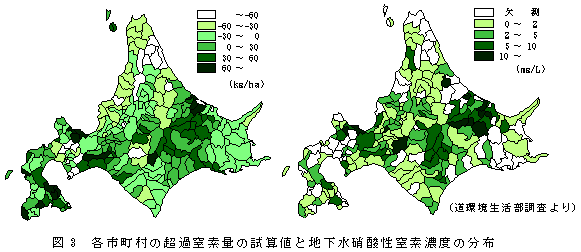 各種統計等に基づき市町村毎の施肥、ふん尿、生物固定、かんがい水由来の投入窒素量を求める。これから窒素環境容量を減じた超過窒素量の全道平均は2±52kg/haであり、畑酪主体(24kg/ha)>畑作主体(20)>水田主体(-8)>草地主体(-12)の順である(図3)。 |