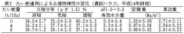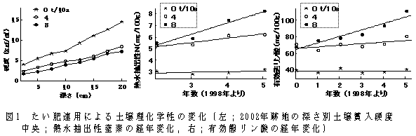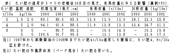 たい肥連用による土壌物理性の改善効果はたい肥4t/10aで認められ,8t/10aとの効果の違いは小さい(表2,図1)。また,たい肥8t/10aの投入(窒素で35kg/10a)はトマト1作による窒素持ち出し量23〜25kg/10aより明らかに多く,周辺環境への負荷回避を考慮すると,連用量は4t/10aが適当である。 |