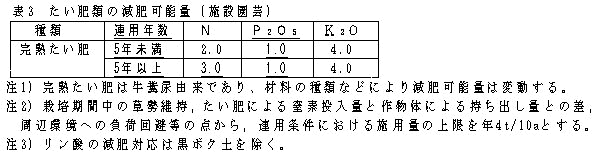 たい肥1t/10a連用により有効態リン酸が0.5〜1.0mg/100g高まることから(図1),リン酸施肥対応は,連用条件下でたい肥1t/10a施用につき1kg/10a減肥する。ただし黒ボク土は除外する。 |