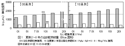 30cmの混和深では、オ−チャ−ドグラス(OG)収量はたい肥施用により高まる。一方、シロクロ−バ(WC)収量はたい肥7.5t/10aまでは高まるが、それ以上の施用量では一定ないし減少する傾向を示す(図1)。 |