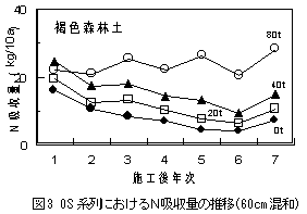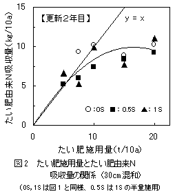 60cmの混和深では、たい肥施用による増収効果は更新7年目でも持続する。N吸収量の増加も収量と同様に持続するが(図3)、たい肥由来N利用率は2〜6%で30cm混和より低い。 |