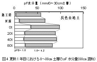 粗孔隙など土壌物理性は、心土破砕、暗渠の施工を含む60cm深までの下層混和により改善されるが(図4)、たい肥施用の影響は明瞭でない。 |
