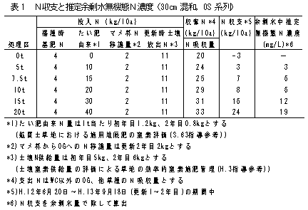 N収支から、30cm混和では降水量から蒸発散量を差し引いた余剰水(浸透水)中推定無機態N濃度が、15t、20t区で10mg/Lを超える危険があり(表1)、実測した硝酸態N濃度も15、20t区で高まる(表2)。60cm深混和でも余剰水中推定N濃度は20t/10a以上で高く、実測した硝酸態N濃度も40、80t区で高まる。 |