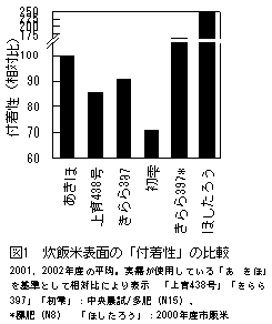 テクスチャーアナライザーを用いた炊飯米の25%圧縮・引き上げ試験を行い、負領域の仕事量を「付着性」として「あきほ」を基準とした相対比により北海道米4品種・系統を評価したところ、炊飯米表面の「付着性」は「あきほ」より「上育438号」および「初雫」が低い(図1)。 |