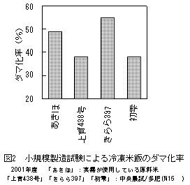 冷凍米飯の篩別重量割合より算出した「ダマ化率」は、「あきほ」と比較して「上育438号」および「初雫」が低い(図2)。 |