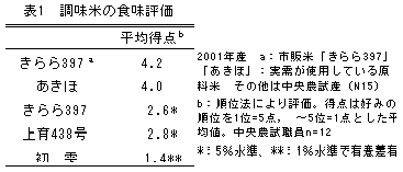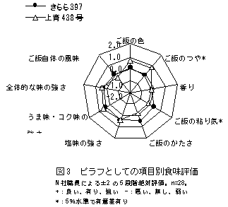 「初雫」は具材無しの調味米において食味評価が著しく低く(表1)、冷凍食品メーカーにおいて「上育438号」を用いて冷凍ピラフ製造試験を行ったところ、現行商品と比較して食味は劣ることなく、社内基準を満たしている(図3、表2)。 |