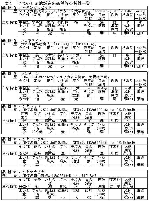 「インカレッド」は初期成育が遅く倒伏が多い。塊茎は楕円形で、皮色と肉色は赤で明らかな特徴がある。枯凋期は中晩生で、低でん粉価で上いも重は「男爵薯」より少ない。そうか病に強い抵抗性をもつ。用途は調理用で煮崩れはない(表1)。 |