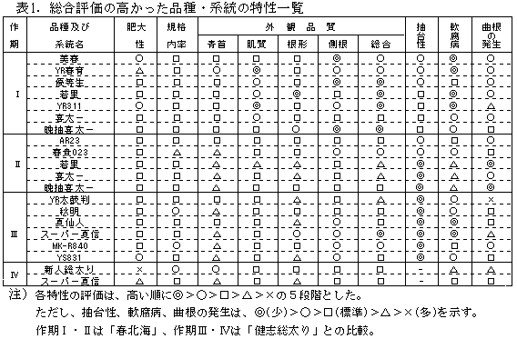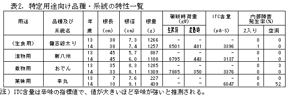 | だいこん栽培の各作期で求められる重要な特性に優れた品種・系統を選定し、特性を評価した。また、特定用途向け(漬物用、煮物用、薬味用)だいこんの特性を評価した。近い作期の間であれば、かたさの予測が可能であった。 | |