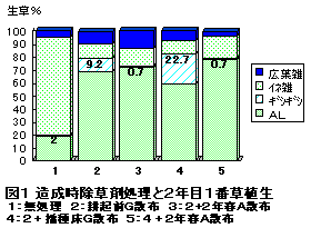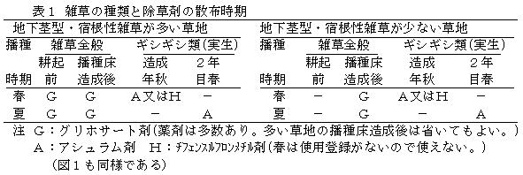 グリホサート剤の耕起前処理(NO2〜5)によりイネ科雑草が、播種床処理(NO4、5)により実生からの雑草(NO4、5)が軽減され、実生のギシギシ類は牧草出芽後のアシュラム剤散布により軽減(NO2に対するNO3、NO4に対するNO5)される(図1)。既存の成績などをふまえ各剤の散布要領を表1とすると、雑草の軽減に効果的である。(散布にあたっては除草剤使用基準に準拠する) |