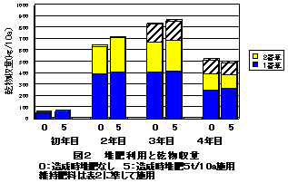 堆肥を造成時(5トン/10a)と維持肥料(3年目からカリ全量分相当:3年目2トン/10a、4年目2.6トン/10a。不足するカリとリン酸分は化学肥料施用)として利用することにより、アルファルファの乾物収量は全量化学肥料施用と同等である。(表2、図2)。 |