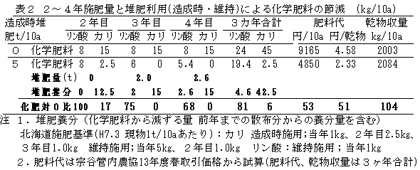 堆肥の利用で3ヶ年(2〜4年目)の化学肥料はリン酸が19%、カリが94%節減され、生産された乾物収量1kg当たりの化学肥料代を試算すると若干の収量増もあり約半分となる(表2)。 |