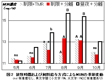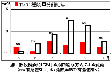 全道におけるMUNの平均値±標準偏差は、11.4±3.9mg/dlで、平均値±1SDの範囲は7.5〜15.2mg/dlであり、当面これらを北海道MUN値とする(表)。調査農家において放牧時MUNの変動は、放牧飼養体系と極めて強く関連している(図1)。放牧飼養体系の有無は、飼料給与方式の差より大きい(2mg/dl程度に対し3〜4mg/dl)。 |