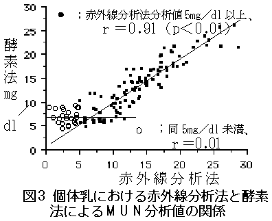 個体乳MUNは、牛群検定情報の日常検査法として使用されている現状の赤外線分析法分析値の特性として以下のことが明らかにされた(図2)。