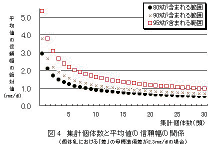 「差」の変動要因の半分程度は個体毎の偏りが原因となっていることから、複数個体のMUN値を平均することで、個体毎の偏りを相殺して精度良く平均値を推定可能である。±1mg/dlの信頼幅で平均値を推定する場合、80%の確かさを得るためには9個体、90%では15個体、95%では21個体のデータが必要である(図3)。 |