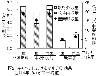 有機100%区で収量低下の大きかったキャベツ、はくさいでも白黒マルチを使用することにより規格内収量は化学肥料区とほぼ同程度となる(図2)。これは、マルチにより土壌水分が保持されたため有機質肥料や土壌窒素の無機化が促進され、さらに窒素の溶脱も抑制されるためと考えられる。 |