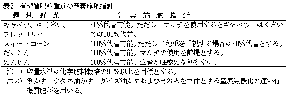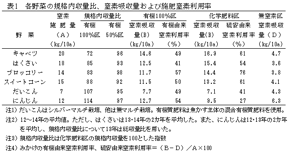 収量水準からみると、にんじんおよびマルチ栽培のだいこんでは施用窒素の100%を有機質肥料で代替できるが、キャベツ、はくさい、ブロッコリーでは50%となる(表1)。
