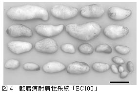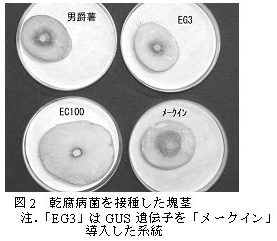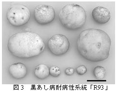 | 耐病性遺伝子をアグロバクテリウム法によりばれいしょに導入し、アカザ・キチナーゼ遺伝子を導入した「男爵薯」から乾腐病耐病性、リゾチーム遺伝子を導入した「メークイン」から黒あし病耐病性の系統を選抜した。これらの塊茎の外観は原品種と同様である。 | |