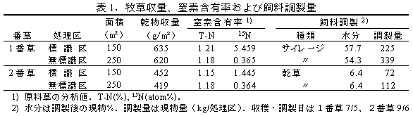 重窒素標識肥料を草地に施用し重窒素標識飼料を得る。チモシー単播草地150m2に8.36atom%の重窒素標識硫酸アンモニウム10g/m2を早春施用し、市販の化学肥料を併用標準栽培を行うと、重窒素含有率5.46atom%の1番草と同1.45atom%の2番草が得られるので、これらをサイレージまたは乾草に調製する。また、馴致期間中に給与する重窒素無標識飼料についても、並行して標準的な栽培と調製を実施する(表1)。 |