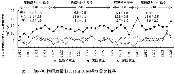 重窒素標識飼料を乳牛に給与する。併給飼料を給与するとふん尿の重窒素濃度が低下するので、成雌牛の牛体維持に要する養分量以上を粗飼料で給与する。重窒素無標識サイレージによる馴致期間(1期:8日間)の後、重窒素標識飼料(2期:サイレージ14日間、3期:乾草6日間)を給与する。その後、体内に残存した重窒素を回収するため、重窒素無標識サイレージを9日間給与する(4期)。 |