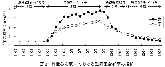 乳牛から重窒素標識ふん尿を採取する。2〜4期の29日間にふん394kgと尿141kgを分別採取する。飼料の乾物摂取量が1日当たり乾物5.8〜6.8kgのとき、日排ふん量は13〜15kg、日排尿量はサイレージ給与期間に5〜6kg、乾草給与期間に2〜3kgで推移する(図1)。ふん尿中の重窒素含有率は、重窒素標識飼料の給与開始とともに上昇し、ふんで3.80 atom%、尿で2.62atom%まで高まる(図2)。 |