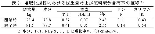 重窒素標識堆肥を調製する。 5cm前後に細切した水分調整用の重窒素無標識乾草2.4kgと2〜4期に採取した重窒素標識ふん121.0kgを数回に分けて混合しながら容器に充填し、屋根付きの網室内において70日間堆肥化を行う。堆肥化に伴い現物中の肥料成分含有率はやや上昇するが、重窒素含有率の変化は少ない。ただし、総重量および水分は26〜27%減少し、窒素現存量はアンモニア揮散や脱窒等により18.6%減少する(表2)。 |