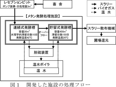 - 原料の乳牛ふん尿スラリーはポンプで連続式発酵槽に1日3m3投入され、42℃に加温し発酵される。貯留式発酵槽では発酵温度が20℃以上の設定で、連続式発酵槽から流入する処理液を散布まで発酵させつつ貯留する(図1)。生成したバイオガスは酸化鉄資材による硫化水素の除去後、発酵槽加温用ガスボイラの燃料として利用する。