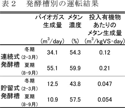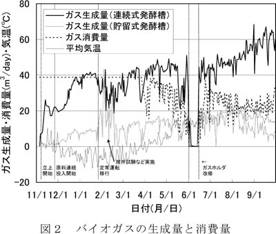 - 本施設は冬期間でも運転開始時の発酵槽立ち上げ操作が可能である。定常運転中は1年を通じてバイオガスのみで発酵槽を設定温度に保持できる(図2)。