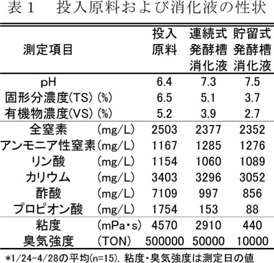 - 本施設のメタン発酵処理によってふん尿中の有機物濃度やプロピオン酸などの悪臭成分は減少し、粘度や臭気強度が低下する(表1)。雑草種子は42℃の発酵温度で死滅する。