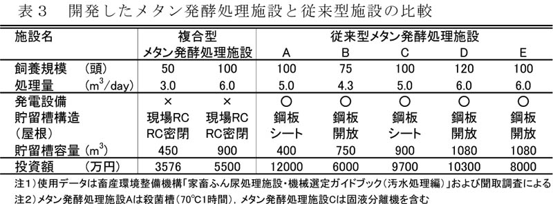 - 搾乳牛50頭のふん尿処理を想定した本施設の総工事費は3576万円となった。想定飼養頭数を100頭とした場合の総工事費試算額は約5500万円で、発電設備を備えた同規模の既存施設に比べ総工事費は3〜4割低減可能である(表2)。本施設の建設にあたって特殊工法などは必要なく、施工は大手の総合建設会社に限らず、道内各地の建設会社で対応が可能である。