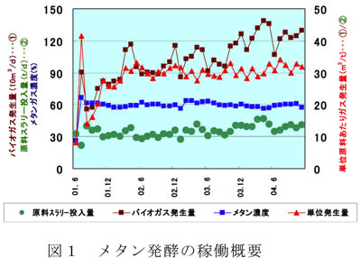 - 積雪寒冷な北海道においてもスラリ−状糞尿、固液分離後の液分(スラリ−)および尿溜め液を原料とし、原料投入や消化液の排出に支障がない構造のバイオガスプラントであれば、連続的な原料投入と所定温度の維持によりメタン発酵は順調に進行し、投入スラリ−1t当たりのメタンガス発生量は15〜18m3である(図1)。