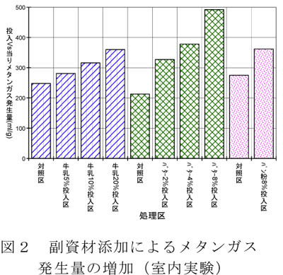 - 室内試験で食品廃棄物の副資材としてのメタンガス産出効果はその組成により異なり(図2)、有機物当たりのメタンガス発生量は糞尿:0.23m3/kg、牛乳:0.82m3/kg、バタ−:0.89m3/kg、パン粉:0.87m3/kgである。バイオガスの発生量が大きく低下する投入限界量(全投入量に対する副資材量の割合)はバタ−で10%、パン粉で12%、蛋白質(プロテイン)で8%であり、N分の多い有機物で限界量が少なく、副資材の利用にあたっては注意を要する。