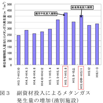 - 湧別の200頭規模の施設において、廃牛乳や給食残滓を副資材として投入すると、原料投入量当たりのメタンガス発生量は1.3〜1.4倍に増加する(図3)。