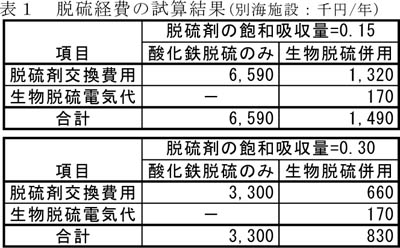 - 脱硫経費は、充分機能する生物脱硫施設を併設する方が酸化鉄脱硫単独の場合よりも安価であると試算される(表1)。前者の脱硫法ではイオウ資源の循環がなされる事もあり、生物脱硫の併用が望ましい。